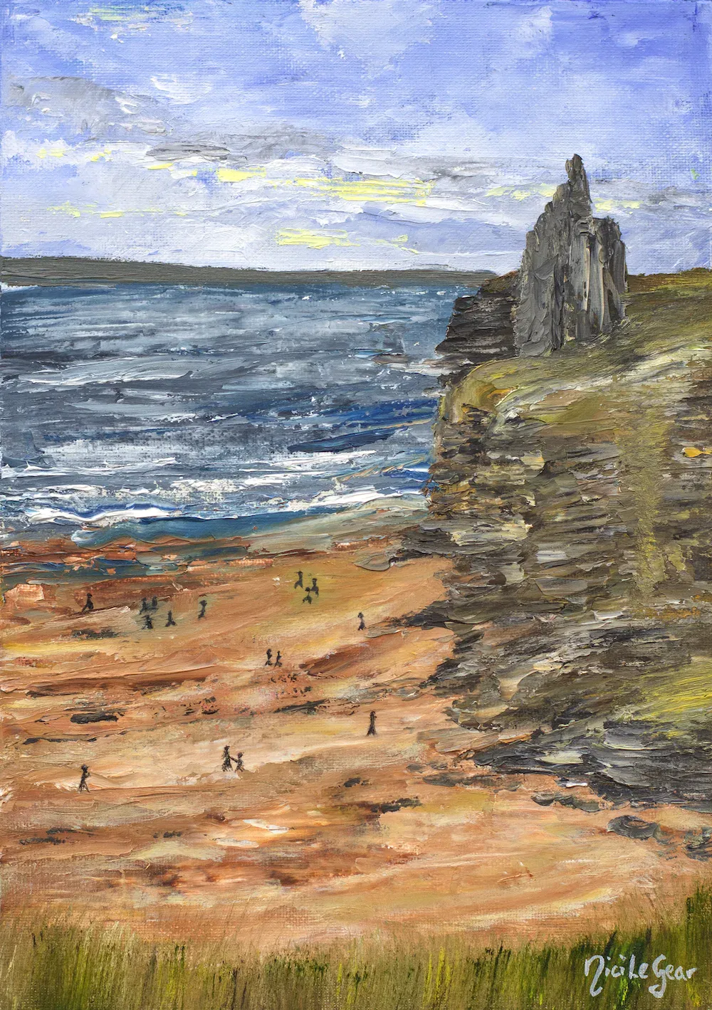 Experience the soul of the Wild Atlantic Way. This evocative A4 oil painting, Strolling Ballybunion, captures the haunting beauty of Kerry’s coastline during its quietest, most contemplative months. Against a moody, overcast sky, the historic castle ruins stand guard over bundled walkers and the churning Atlantic tide. With its sophisticated cool palette and rich textures, this piece perfectly encapsulates the peaceful solitude of the Irish coast in winter.